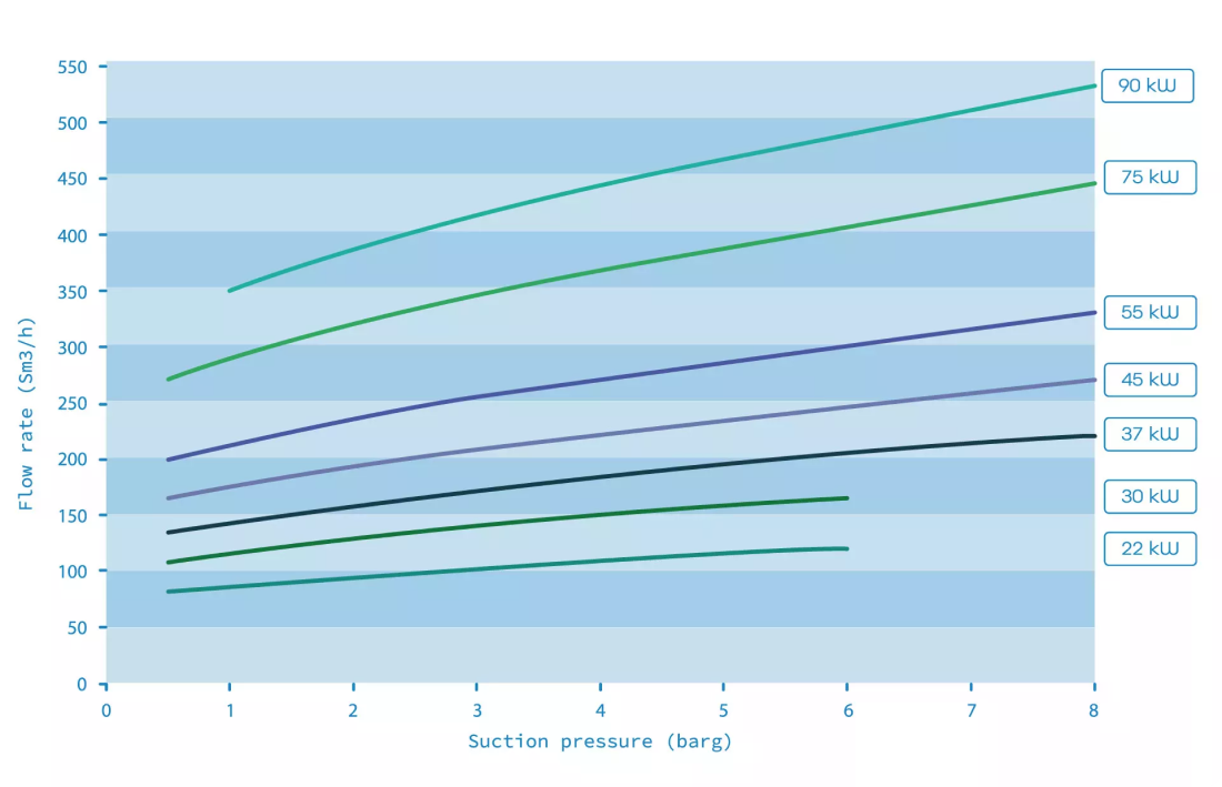 Radial şəkildə yerləşdirilmiş 3-dən 5-dək silindrli mexaniki kompressorlar 22 kVt-dan 110 kVt-dək güc sərf edir.